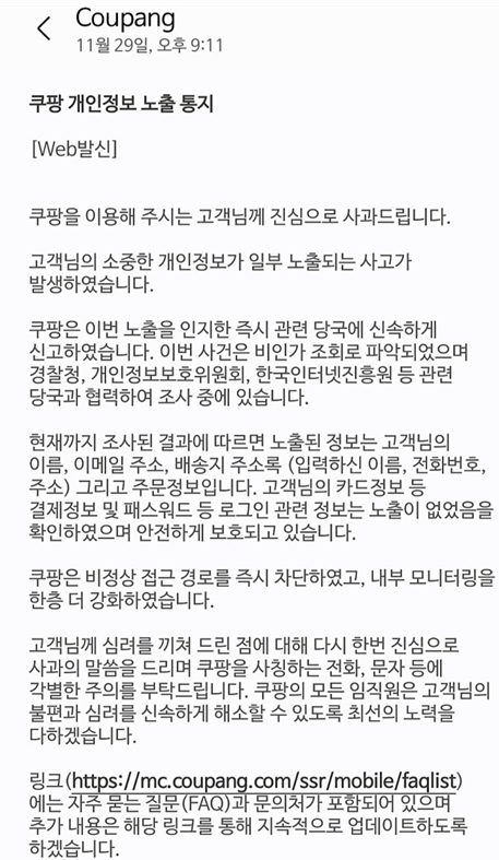 쿠팡은 이번 유출 사건이 알려진 후, 박대준 대표 명의의 사과문을 발표했습니다.